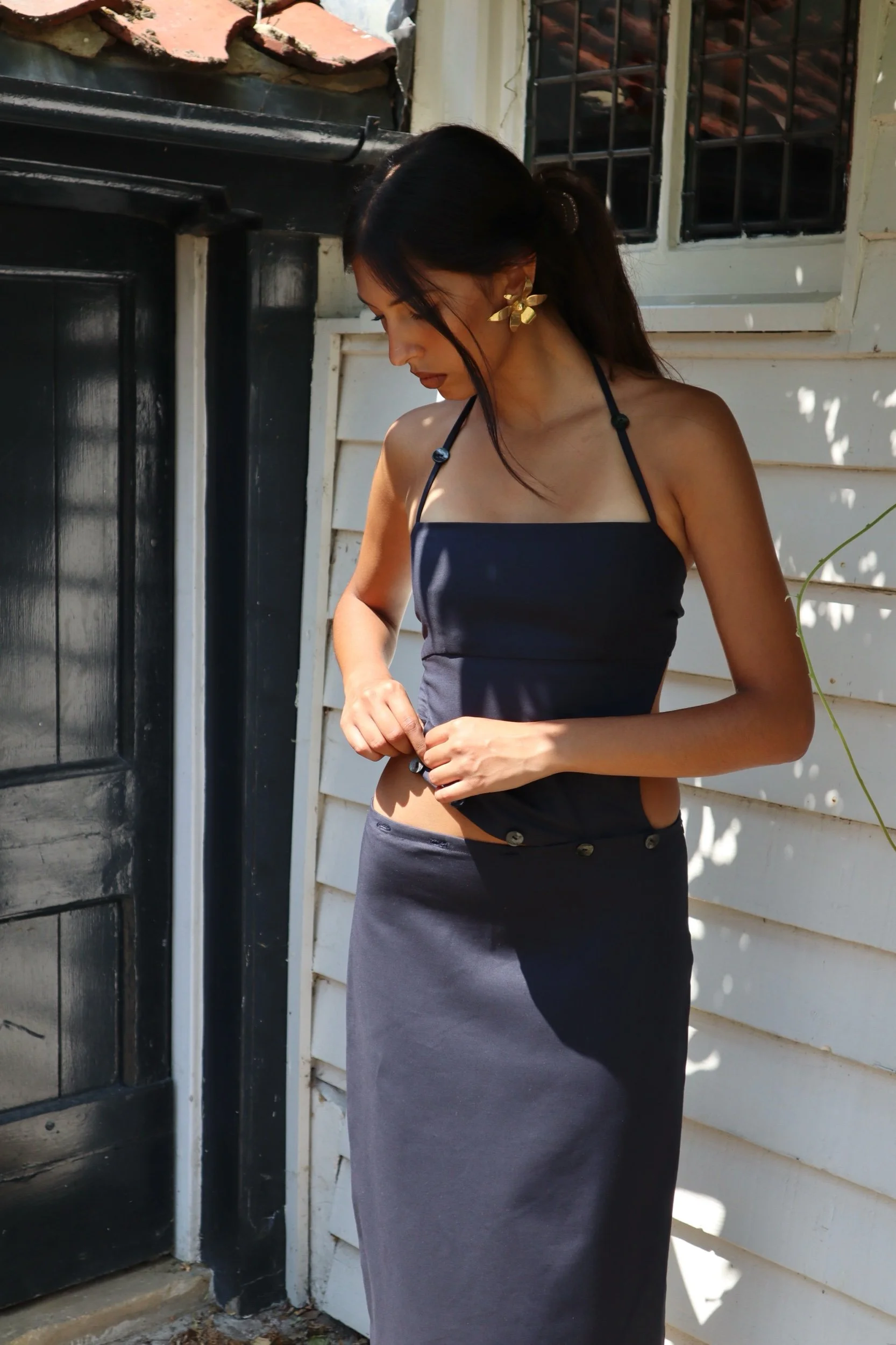 The Salt Box Multiwear Dress can be worn separately as a top and skirt, or buttoned together at the waist to become a maxi dress.