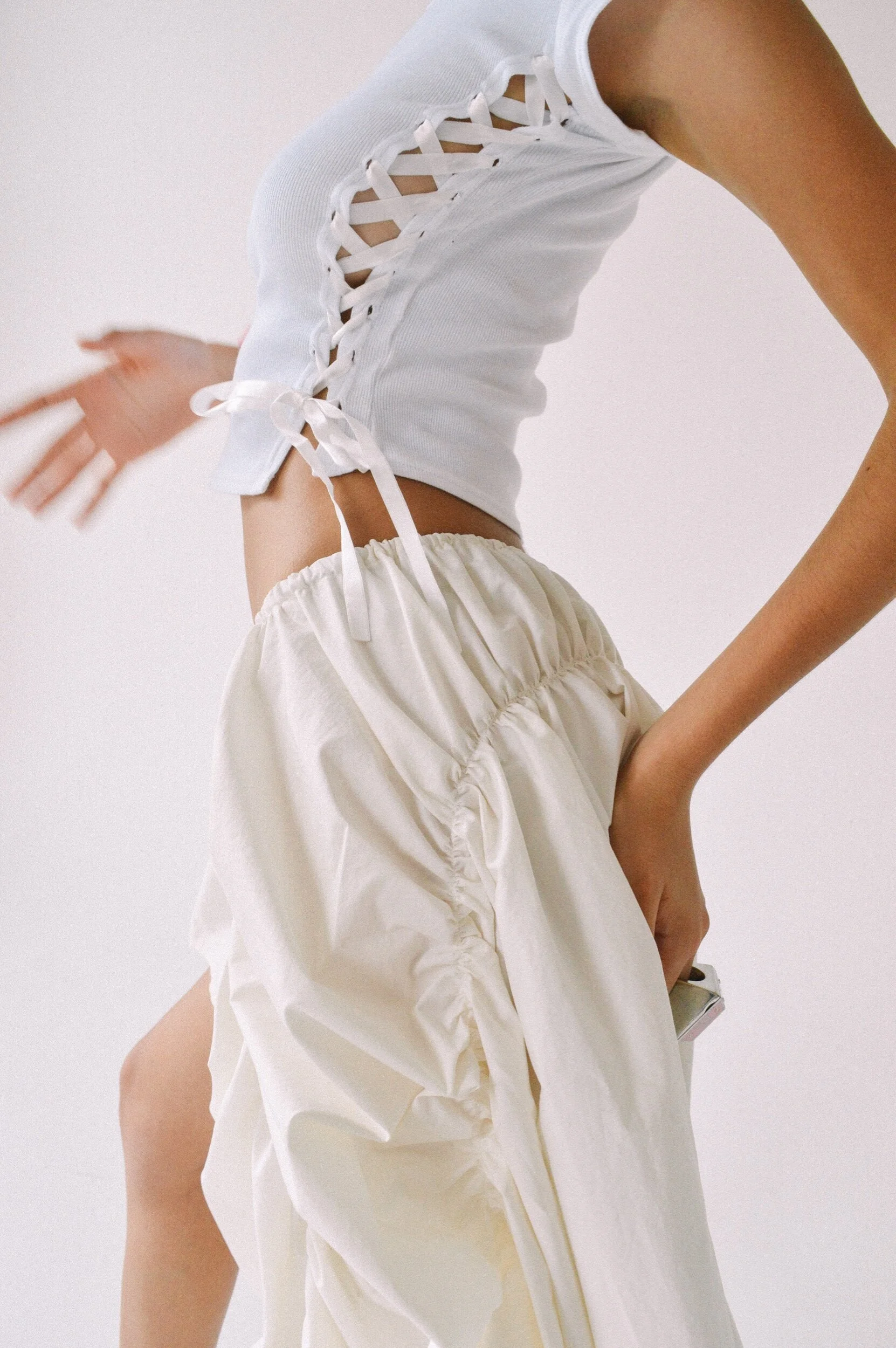 One of my favourite designs ever, a variation of my Gemini skirt, the Venus in Gemini skirt has an asymmetrical drape and has the look of an Edwardian under skirt. Made to be worn low rise but can also be worn high rise because of the elastic at the waist.