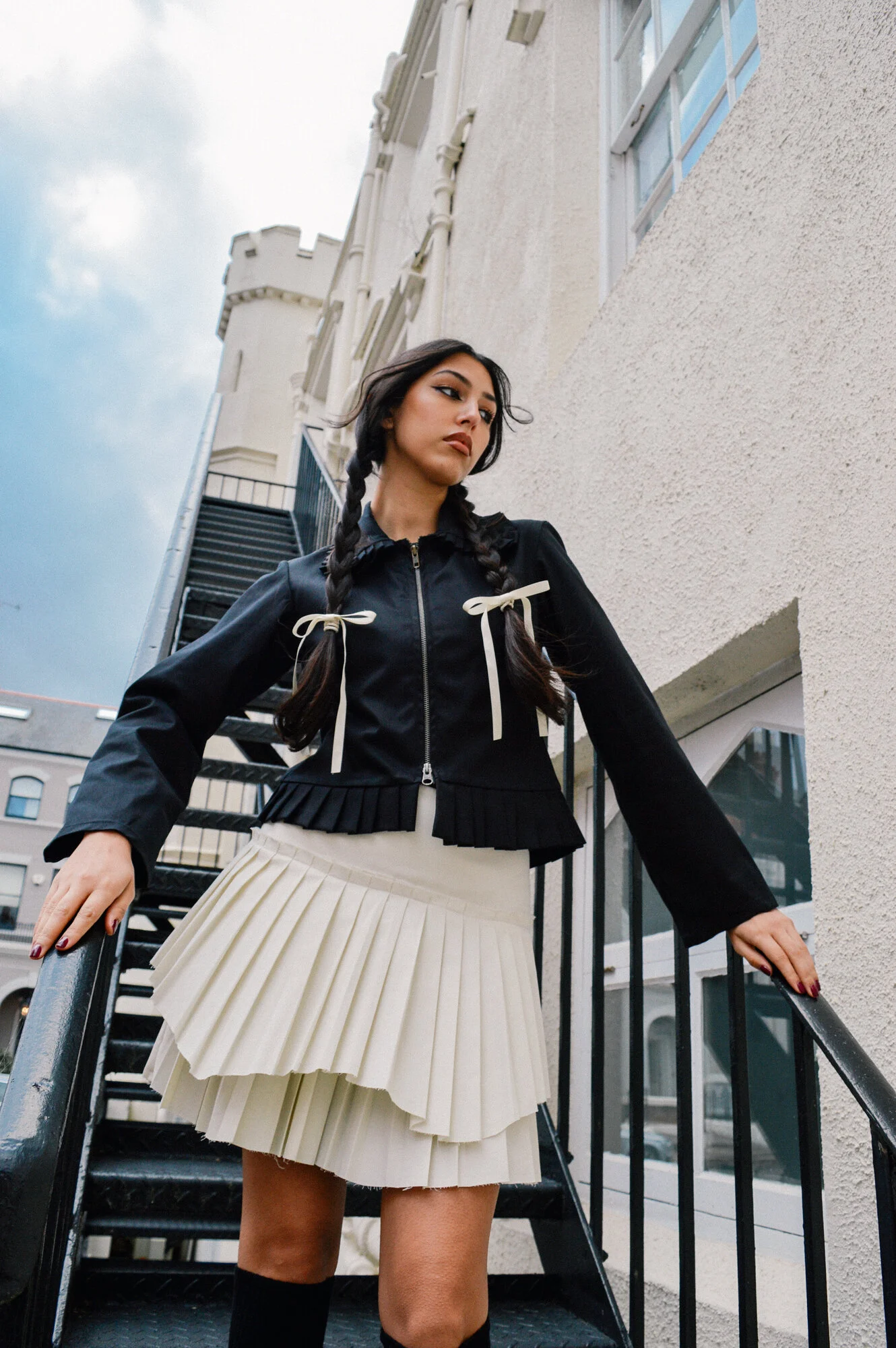 The Sansa pleated double zipper jacket is inspired by Victorian horse riding outfits and features a pleated hem and collar.