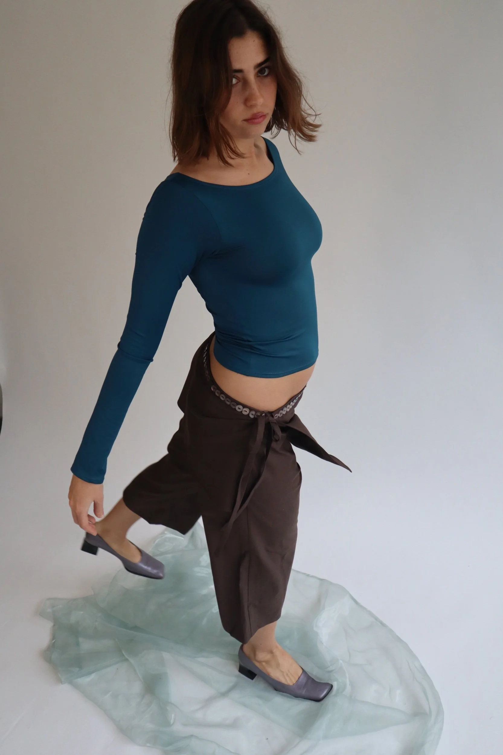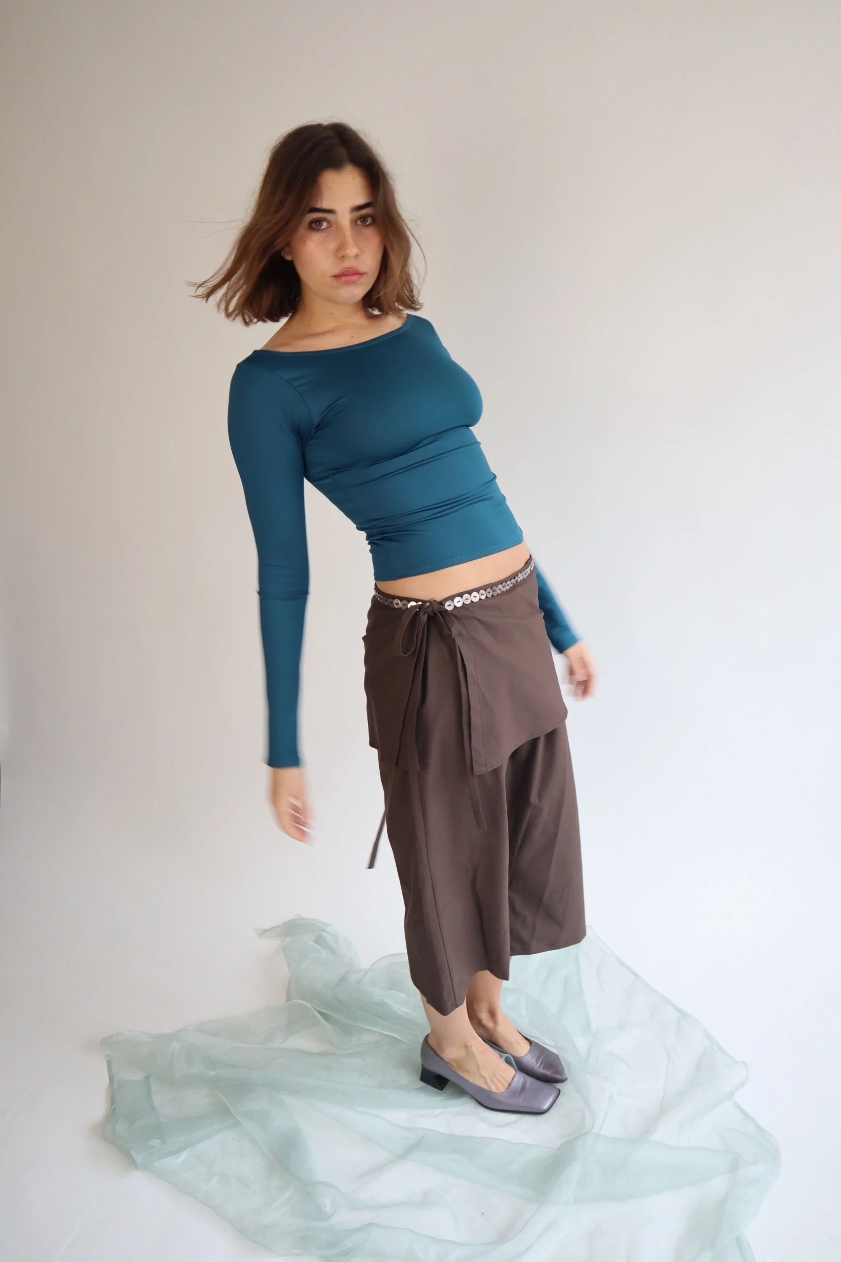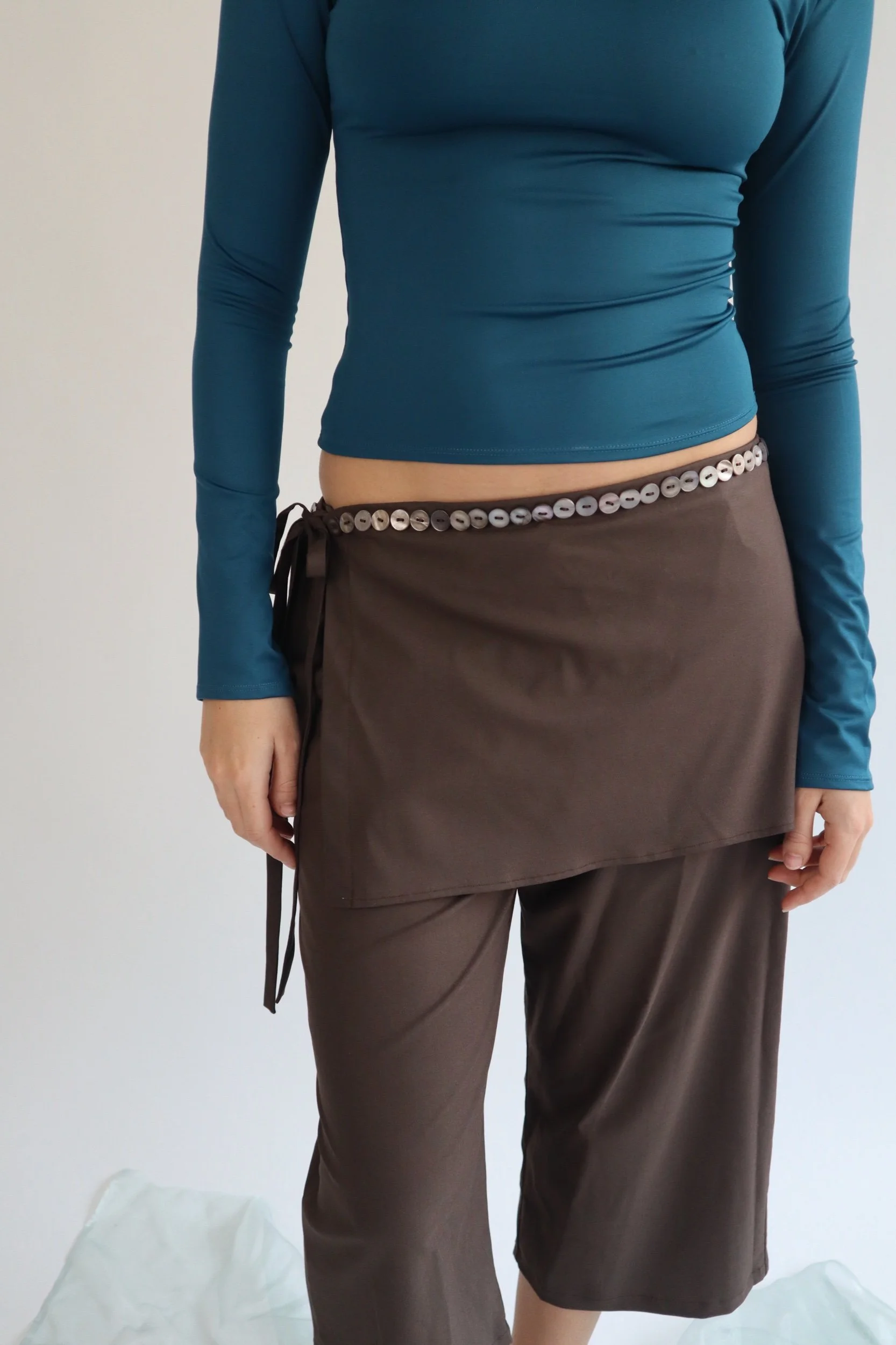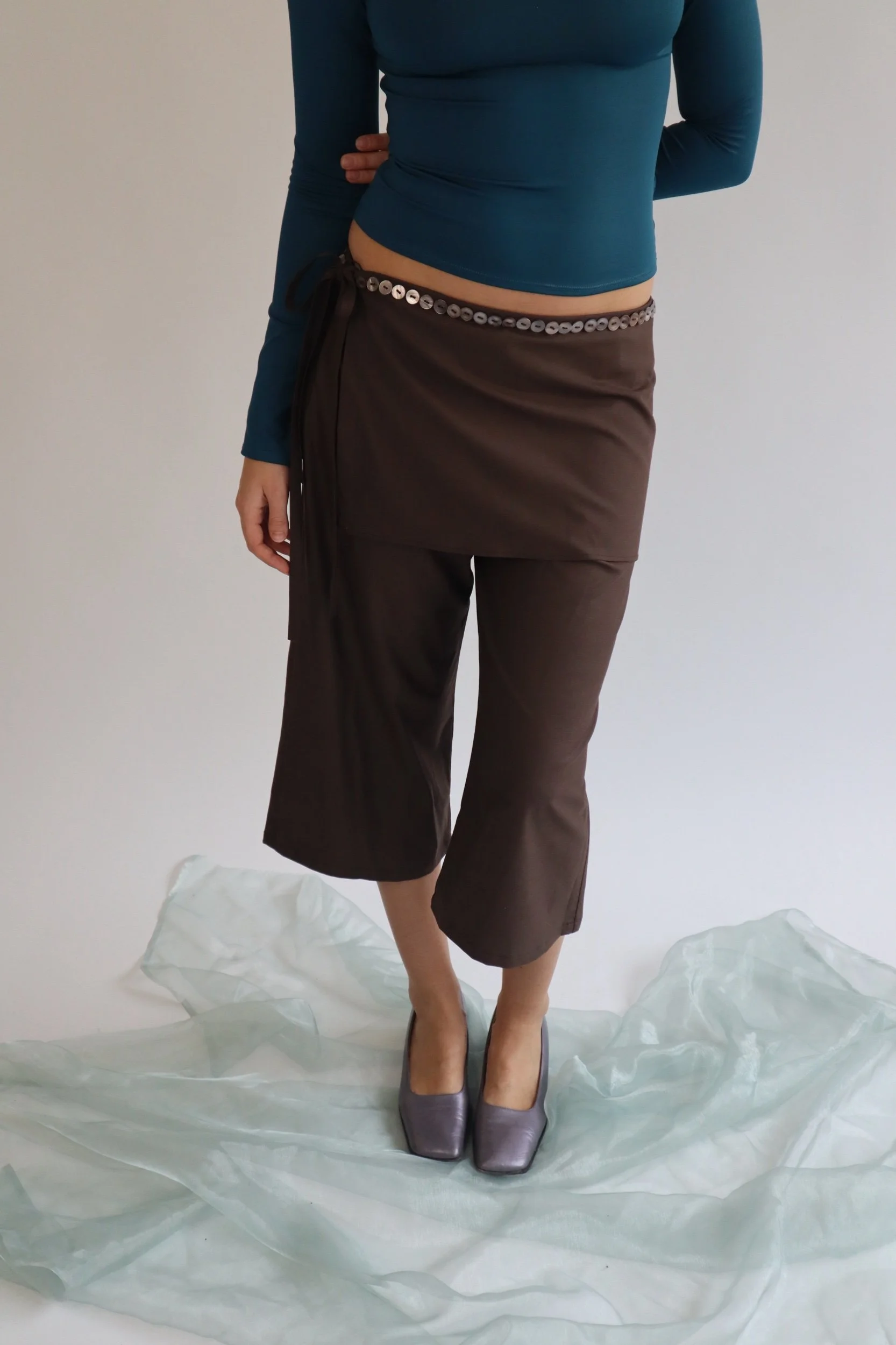 The Villa Capri and Sarong Set in our new AW25 brown suiting fabric. It has a straight leg fit, and a detachable side-tie sarong layer, with a row of mother of pearl buttons along the waistband.