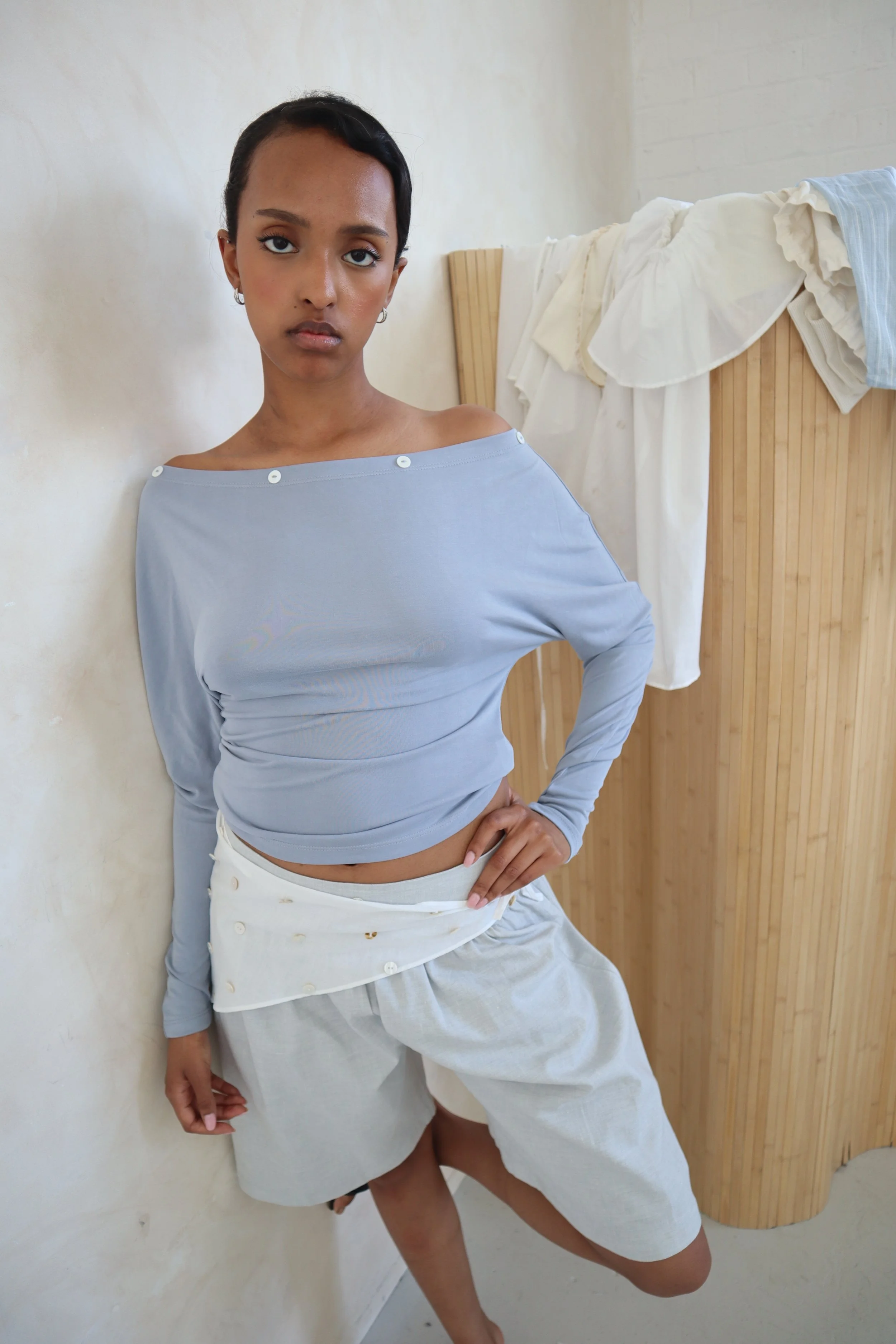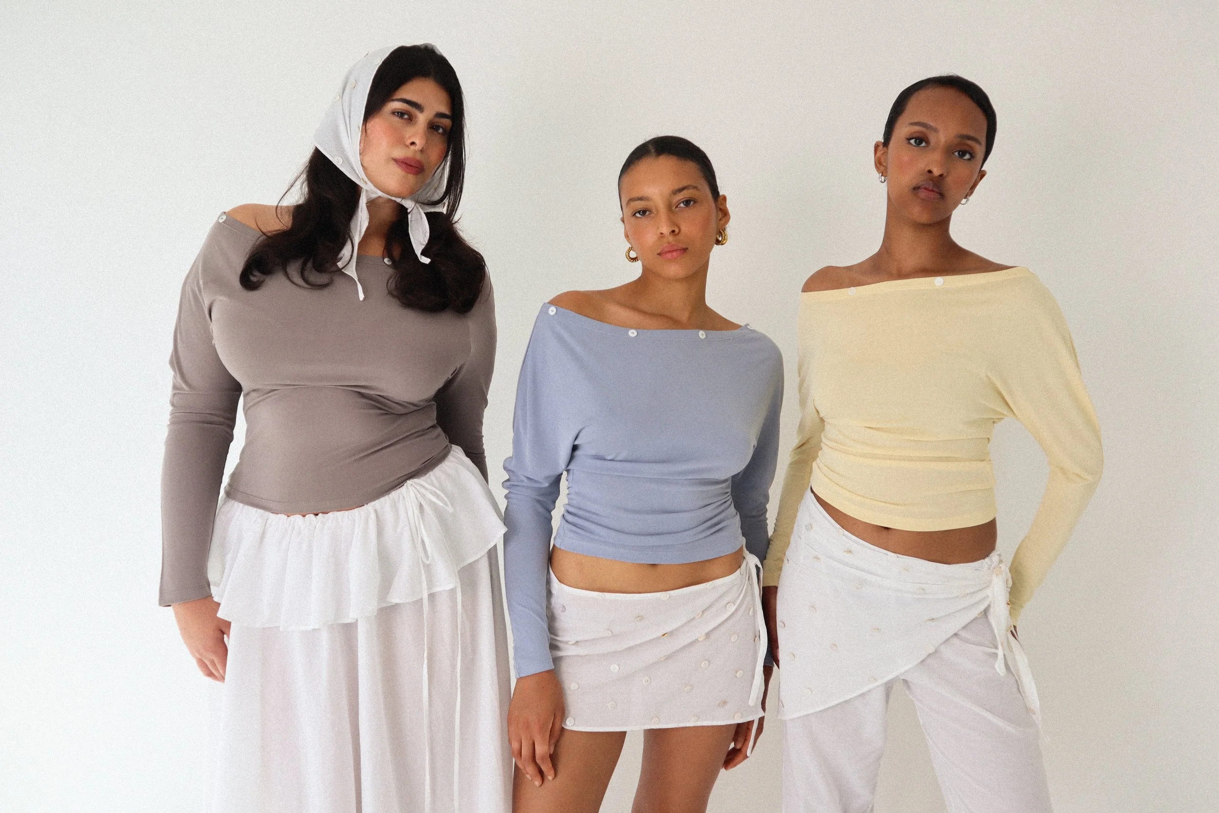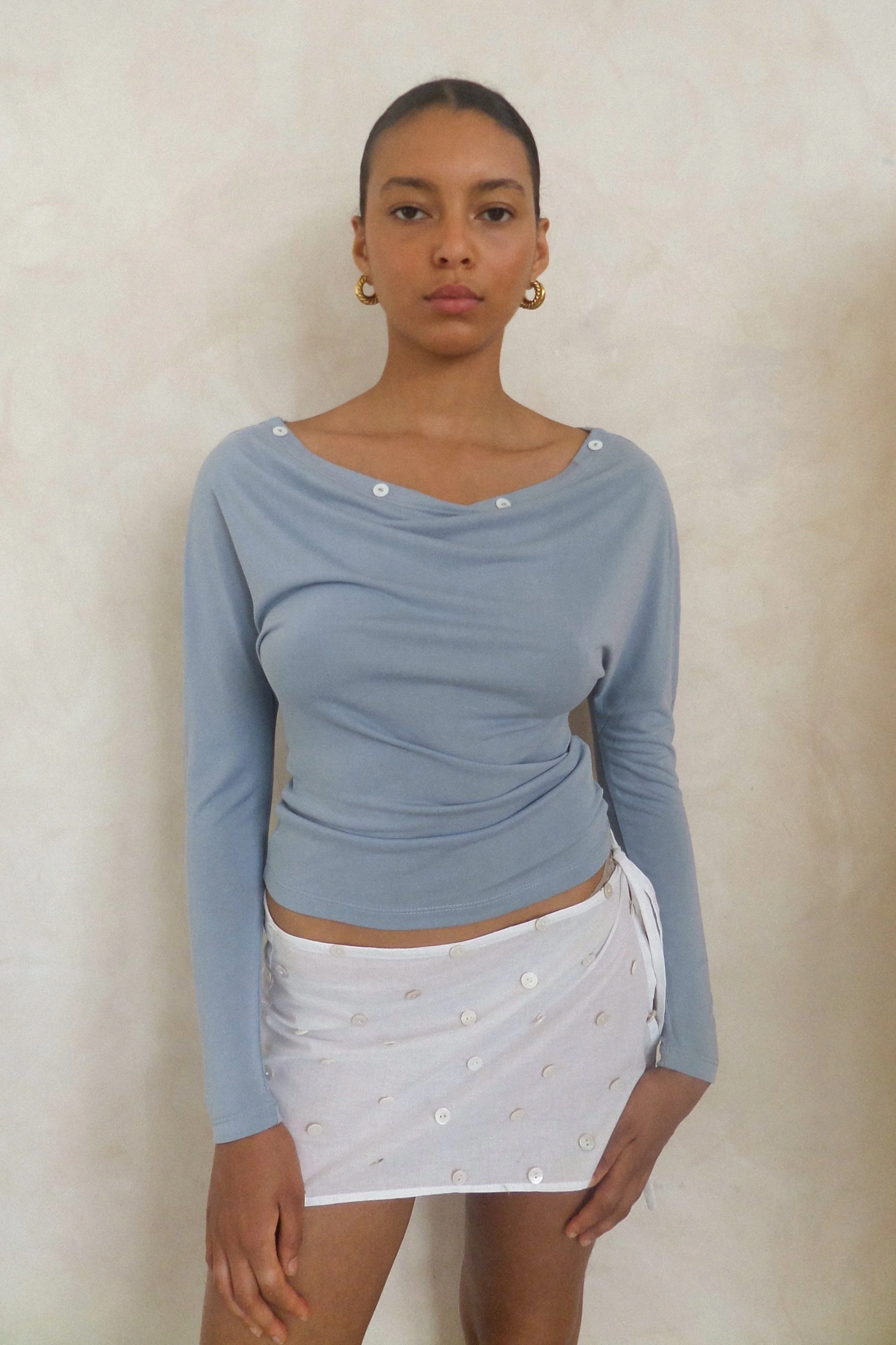 The Ballad Top is back for Summer 25, with a new buttery smooth cupro fabric, allowing for a more lightweight feel, and a looser and more fluid silhouette. Still lined with buttons at the neckline, you can wear the Ballad Button Longsleeve on the shoulders as a cowl or off the shoulders.