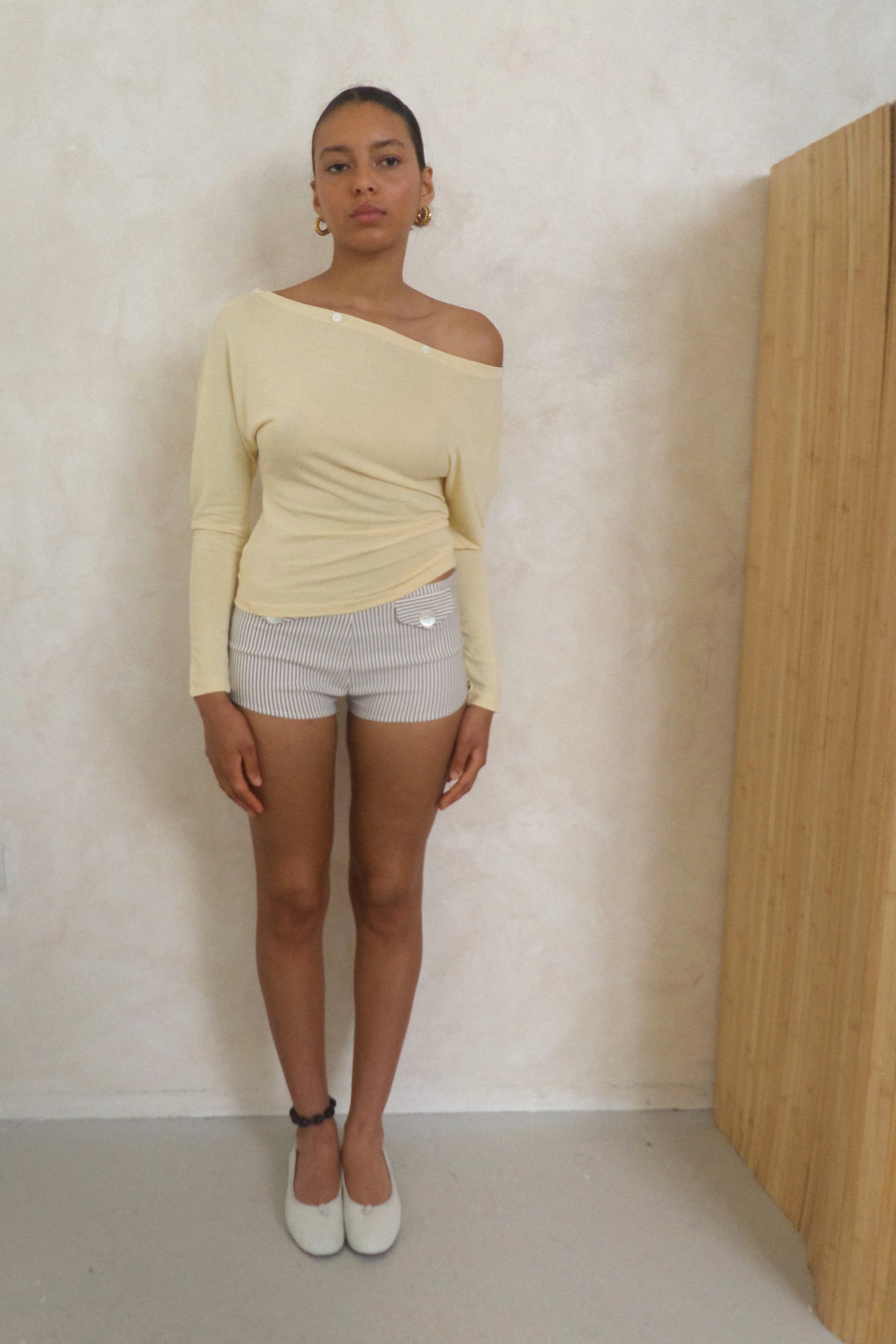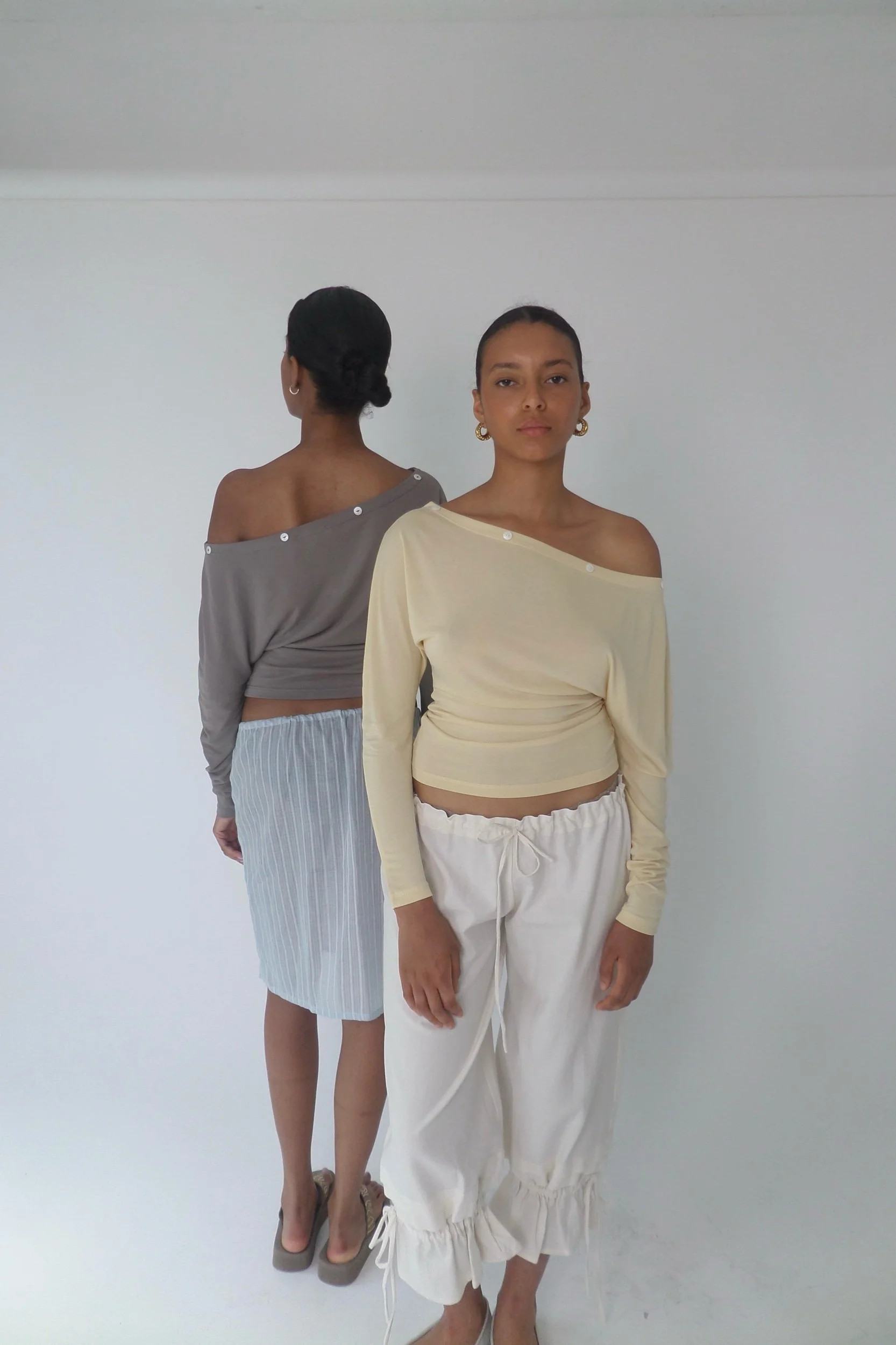 The Ballad Top is back for Summer 25, with a new buttery smooth cupro fabric, allowing for a more lightweight feel, and a looser and more fluid silhouette. Still lined with buttons at the neckline, you can wear the Ballad Button Longsleeve on the shoulders as a cowl or off the shoulders.