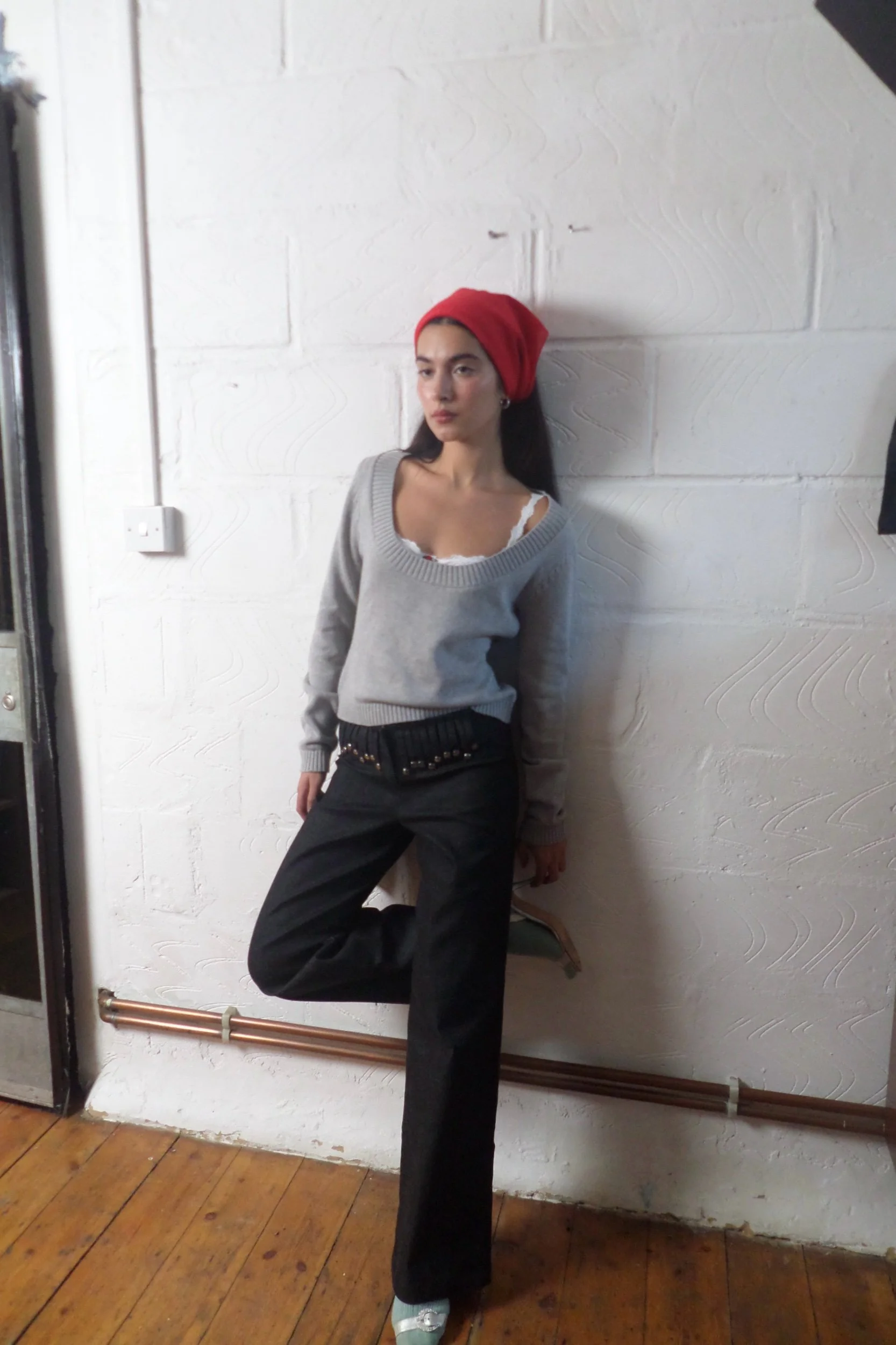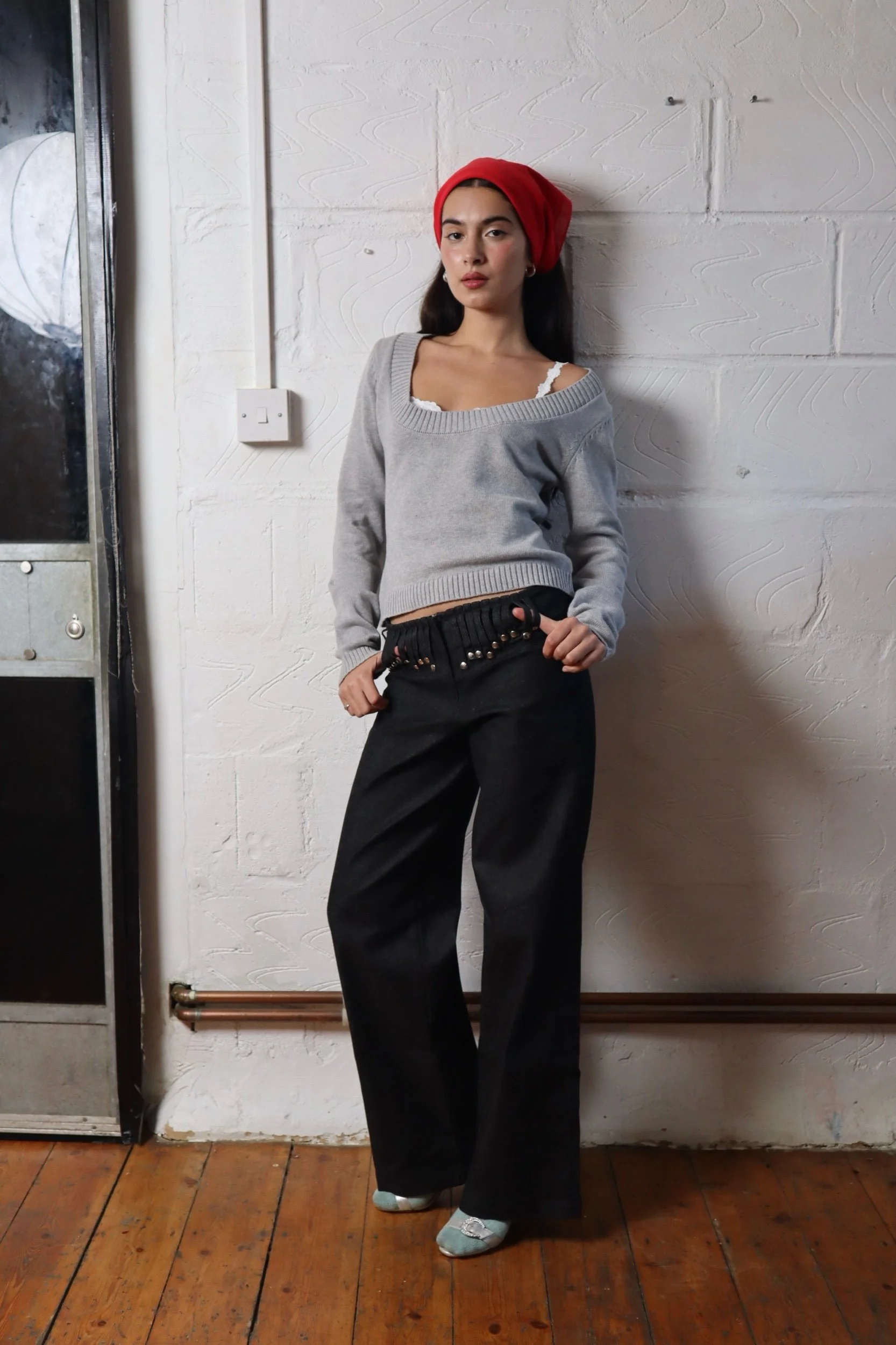 The Constellation Studded Jeans are a regular straight leg fit, low rise, and have a belt-loop lined waistband held in place with chrome studs. It features a half moon back pocket.